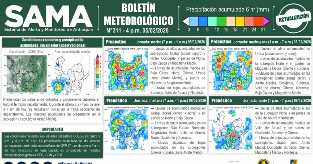 El Departamento Administrativo de Gestión del Riesgo de Antioquia (Dagran) ha instado a la comunidad a extremar las medidas de precaución ante el pronóstico de un incremento en la actividad de lluvias a partir de este viernes 6 de febrero. De acuerdo con el Sistema de Alerta y Monitoreo de Antioquia (SAMA), la influencia de